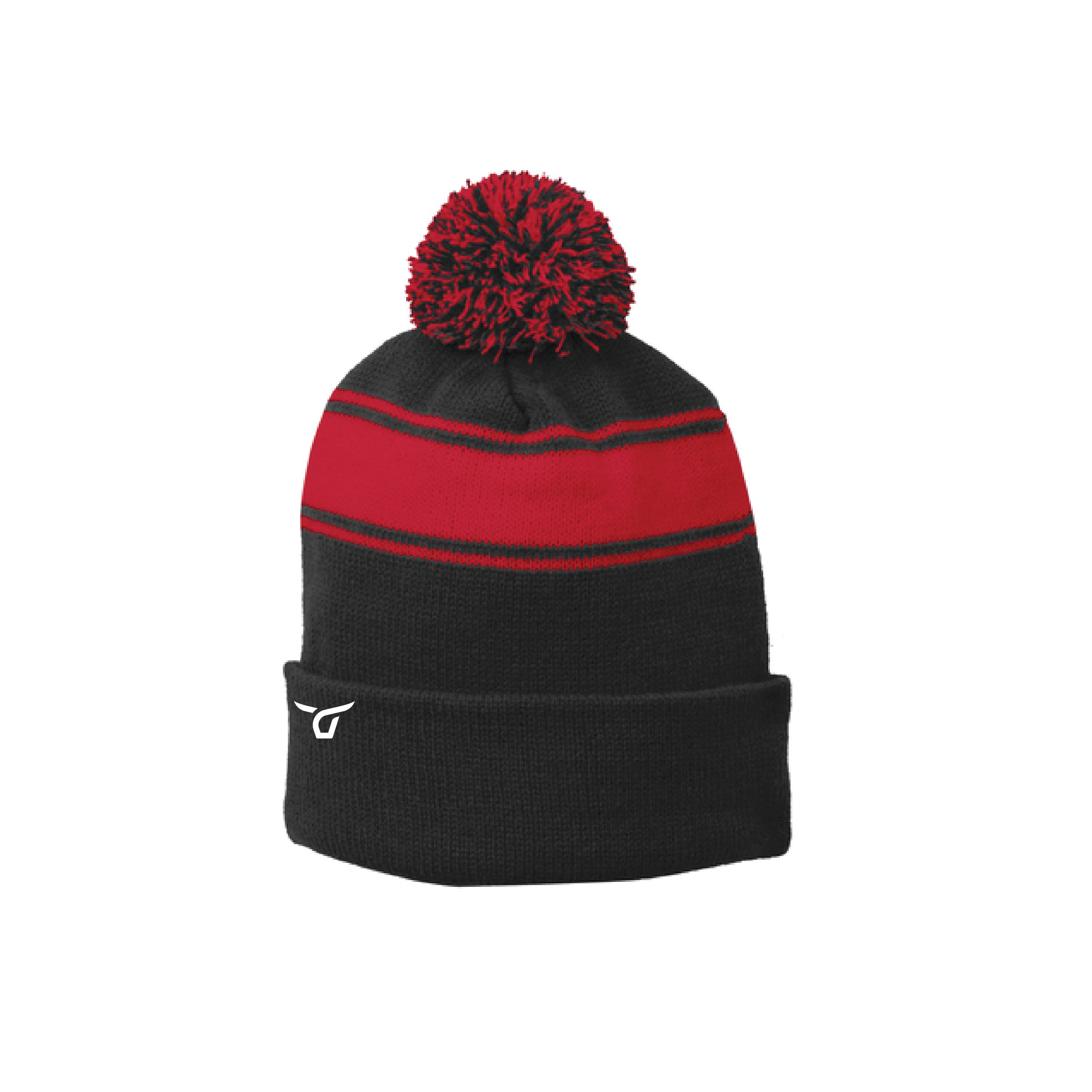 A fan fave: a classic beanie with three stripes and a two-tone pom.